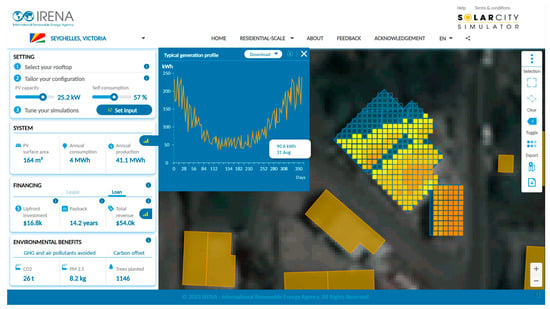 The SolarCity simulator (solarcity.irena.org, last visited on 30 November 2023) assists cities seeking to access affordable and reliable energy from rooftop-mounted solar photovoltaic (PV) systems, lower their carbon footprints, and encourage community participation in the energy transition. The simulator is designed to help households, businesses, and municipal authorities evaluate the prospects for generating electricity and revenue from such installations. Figure 4 shows a screenshot of the graphical user interface of IRENA SolarCity simulator.