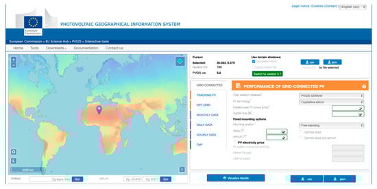 The PVGIS is a web application that allows citizens to extract PV-related data for any location in most parts of the world. More specifically, it provides PV production estimates for different technologies, hourly or aggregated solar radiation, and Typical Meteorological Year (TMY) data. The user can add battery capacity as an additional option including the power consumption profiles in order to assess the viability of battery storage. Figure 5 shows a screenshot of PVGIS frontend.