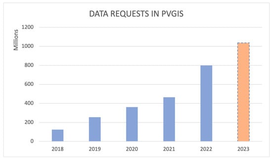 The PVGIS already has a 20-year successful track record. Additionally, its use has significantly grown in 2022, with 6 million unique users and almost 800 million hits, which represents an 85% and 72% increase, respectively, over 2021. Figure 6 shows the progress in terms of unique users from 2018, the moment from which statistics started to be collected.