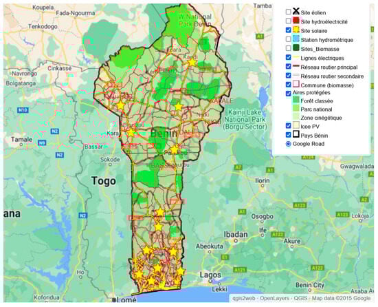 Figure 7. Mapping of selected PV solar sites in Benin. Source: Atlas of renewable energies of Benin, 2023 []. Reproduced with permission from the Ministry of Economy and Finances of the Republic of Benin.