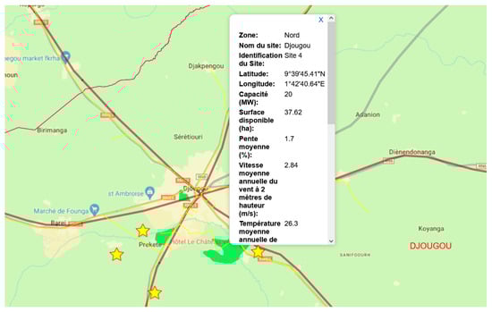 Figure 8. Details of potential PV solar sites in the Djougou area. The stars represent the four potential solar sites and the details in the legend correspond to Site 4 (represented by the star right below the legend). Source: Atlas of renewable energies of Benin, 2023 []. Reproduced with permission from the Ministry of Economy and Finances of the Republic of Benin. - The project of the National Energy Information System in Benin (SINEB) [] has developed and will operationalize an open data-oriented platform to share information and documentation related to the country’s energy sector. The SINEB will also be an online tool for the government to elaborate on the sector’s development strategy and the monitoring of its implementation, including through the elaboration of the country’s annual energy balance sheet. It will allow for a faster and more efficient collection of data, harmonized methodologies, and therefore, more reliable data and statistics. The system will be managed through contribution and validation profiles but will also be open to the public.