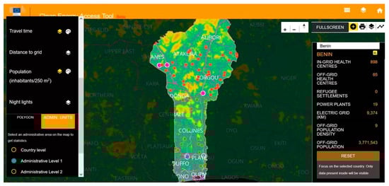Benin has been selected as a pilot country to test the open-access Clean Energy Access tool [,] developed by the JRC in the framework of the Africa Knowledge Platform []. The tool focuses on the electrification of health centres in Benin (see Figure 9), providing a cost estimation of the health centres’ electrification with PVs and autonomous battery systems, an estimation of the power demand, and allowing thus for the optimization of PVs and battery size to meet the demand. The raw data used derives from articles, studies, and open source data, combined with data from other ongoing projects on the ground and benefitted from consultation with the Beninese Ministry of Energy, Ministry of Health, and the Agency for Sanitary Infrastructure, Equipment, and Maintenance. The tool can be further extended to cover educational centres and other consumers, depending on their needs, and shows a high potential for contributing to the preparation of the project for the electrification of 750 socio-community infrastructures, which is identified as a priority project in the PAG 2021–2026.