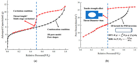 We have carried out low-temperature nitrogen adsorption experiments on more than 1000 shale samples from Wufeng–Longmaxi formations and different wells from southwest China (See Appendix A for details). Typical adsorption isotherms of shale samples obtained from low-temperature nitrogen adsorption experiments at 77.3 K are depicted in Figure 1a. Considering the adsorption and desorption isotherms, from a morphology perspective, a hysteresis loop can be observed between these two isotherms in a large number of samples, which leads to the problem of branch selection for analysis [6]. Furthermore, another common feature of different isotherms is that there is a sudden change in the desorption branch of the isotherm at a relative pressure of 0.5, while the hysteresis loop is closed at a relative pressure of 0.42.