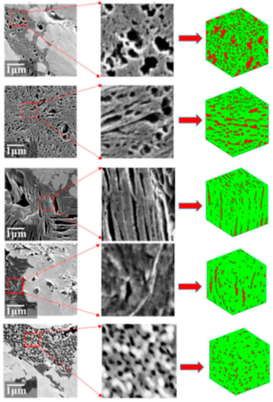 There are two main mechanisms that cause hysteresis. One exists in the one-dimensional cylinder pore or slit geometry with both ends open. The meniscus is cylindrical during adsorption, while it becomes hemispherical on desorption, as depicted by Sarkisov and Monson [7]. The curvature of the spherical meniscus is half that of the cylindrical meniscus, so the condensation pressure is higher than the evaporation pressure [8,9,10]. Previous experiments on low-temperature nitrogen adsorption on molecular sieves represented by MCM-41 have found that the hysteresis loops of columnar nanopores are mostly of the H1 type [11]. Another mechanism exists in ink-bottle pores where the wider cavity is controlled by a narrower pore throat, evaporation in the cavity will be delayed until the evaporation in the pore throat or the cavitation happens [12,13,14,15,16,17,18,19]. According to the classification of the hysteresis loops from IUPAC, hysteresis loops of ink-bottle pores are mostly H2 or H3 types [20]. It can be seen that most of the experimental adsorption isotherms have H2-type characteristics, which means that ink-bottle pores are the main pore type of nanopores in shale reservoirs. Meanwhile, through characterization of shale nanopores using techniques such as focused ion beam-scanning electron microscope (FIB-SEM) and micro-computed tomography (CT), it has been found that various types of pores develop in shale, with complex pore shapes, significant differences in pore sizes, and different connectivity modes between pores, and which have strong heterogeneity and anisotropy (Figure 2) [21,22,23,24].