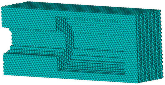Graphite is used to represent the wall of organic nanopores in the molecular model [29,30], and nitrogen molecules are randomly distributed in the pore cavity in the initial state. In previous studies, both the united atomic model and the full atomic model were able to accurately obtain the adsorption–desorption process of nitrogen molecules in nanopores. However, compared with the experimental results of MCM-41, the simulation results of the united atomic model were closer to the experimental results [31,32], and the computational efficiency of using the united atomic model was higher, so the united atomic model is used for calculations. The 12-6 Lennard-Jones potential function is used to describe the van der Waals force between molecules, as follows: