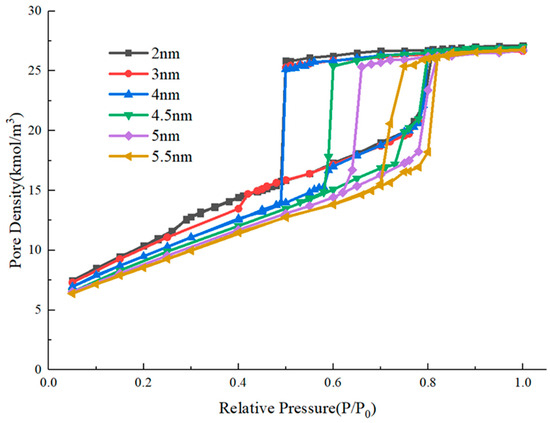 Previous studies have disclosed that, for the ink-bottle pore, there are two kinds of mechanisms that will delay gas evaporation in the pore cavity and lead to an obvious adsorption–desorption hysteresis, including pore blocking and cavitation [12,13,14,15,16]. An obvious difference between these two types is the closure point of the hysteresis loop. For the pore-blocking type, the closure point varies with the diameter of the throat, while for the cavitation type, the closure point is fixed when the diameter of the throat is below a threshold value [33]. In this study, we further quantitatively investigate the boundary between these two mechanisms considering the variation of both the diameter and length of the pore throat. Previous studies with a tubular model have disclosed that the diameter of the throat where cavitation occurs was 3–4 nm. Therefore, we established a collection of ink-bottle pores with throats whose diameters are near this range and whose lengths are variant in a certain range. Firstly, the adsorption–desorption curves of ink-bottle pores with different diameters are simulated with a fixed pore diameter of 6 nm, a fixed pore length of 10 nm, and a fixed throat length of 8 nm. The throat diameter varies from 2 nm to 5.5 nm. The hysteresis loops obtained from the simulations are shown in Figure 4.