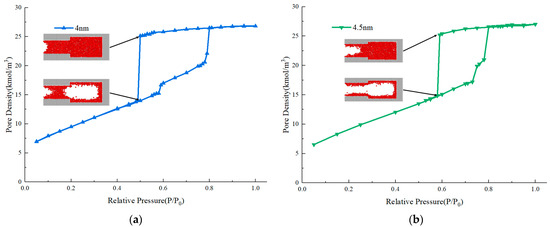 As the size of the pore cavity is unchanged, the relative pressure of the adsorption branch for condensation is close. Observing the desorption branch, there are two types of variations of evaporation pressure of the pores with different throat diameters. When the throat diameter is larger than 4 nm, the evaporation pressure decreases with the decrease of throat diameter. When the throat diameter is less than 4 nm, the evaporation pressure is always around 0.5. The molecular snapshots of the system with throat diameters of 4 nm before and 4.5 nm after the evaporation are provided in Figure 5 to further examine the inner differences. When the throat diameter is 4 nm, evaporation occurs firstly in the pore cavity while the throat is still condensed, the pore cavity of the system undergoes evaporation through cavitation. When the throat diameter is 4.5 nm, evaporation takes place first in the throat, followed by the cavity, with the pore cavity evaporating through the gas–liquid two-phase meniscus, also known as pore blocking. There are two aspects in which this study is consistent with previous research, indicating the effectiveness of the simulation method in this study. One is the transition from pore blocking to cavitation as the throat diameters decrease. Another is that the critical throat diameter for cavitation is about 4 nm. Furthermore, the cavitation pressure found here, which is around 0.5, is closer to that observed in the isotherms of gas shale, compared with previous studies whose cavitation pressures are always around 0.2 and 0.3 [13,14,15].