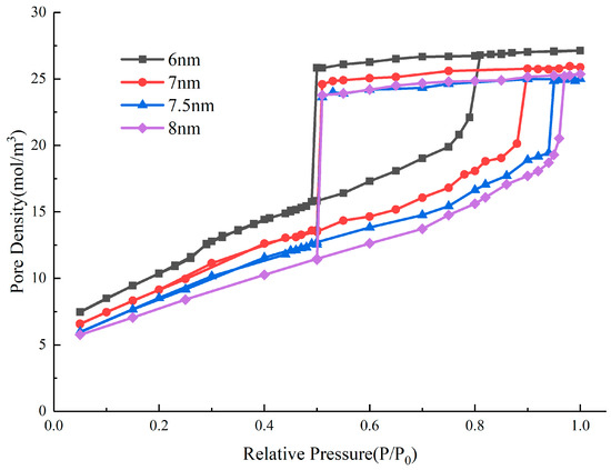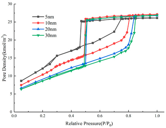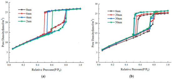 When the relative pressure is about 0.5, and when substituting the above equation, the thickness of the adsorption layer of nitrogen molecules is about 0.715 nm. Once the size of the cavity is determined, RC can be directly obtained through geometric calculations. RC for the parameters and condensation pressures of different cavity sizes—calculated in Figure 12 and Figure 13, respectively—are summarized in Table 2.