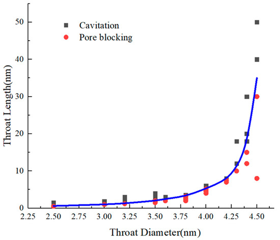 To further obtain the boundary between these two mechanisms quantitatively, the evaporation processes of ink-bottle pores with pore diameters of 2.5–4.5 nm and different pore lengths are simulated. In Figure 7, each point denotes a simulation model with its x-axis value representing throat diameter and the y-axis value throat length. For the black points, the corresponding simulation model experiences cavitation evaporation, while for the blue points, the corresponding simulation model experiences pore blocking evaporation. The blue line indicates the edge of these two mechanisms, which are identified with the molecular snapshots. There is a boundary, depicted with the blue line in Figure 7, that divides the figure into two zones. In the upper zone, cavitation occurs, while in the lower zone, pore blocking dominates.