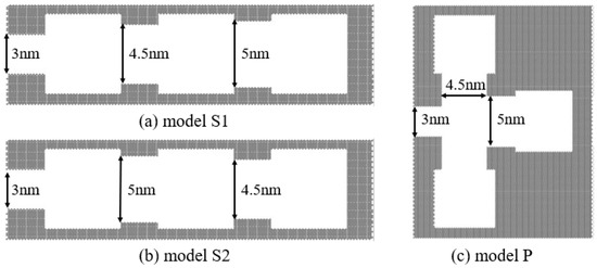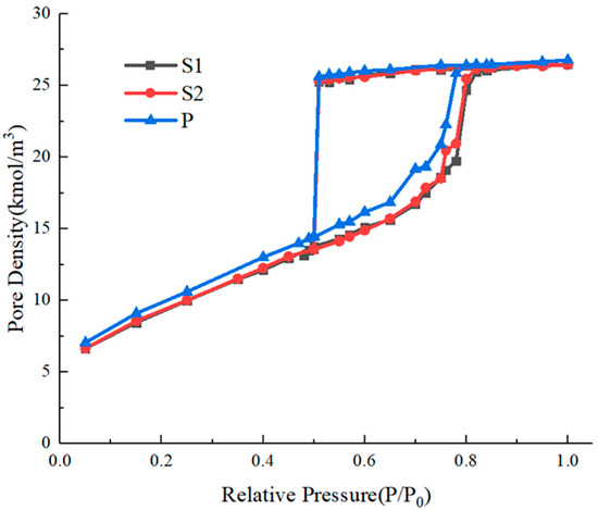 Firstly, we select three basic ink-bottle pore units with different throat diameters of 3 nm, 4.5 nm, and 5 nm and with throat lengths of the units are all 3 nm. We can obtain the evaporation mechanism of each unit from Section 3.1, wherein the units with throat diameters of 4.5 nm and 5 nm evaporate through the gas–liquid two-phase meniscus, while the units with throat diameters of 3 nm evaporate through cavitation. These three units are connected in different connection sequences. Two systems with these three units connected in series are constructed and named model S1 and S2, while one system with units connected in parallel is constructed and named model P. The common feature of the structure is that the internal structure is connected to the external bulk space through a throat that belongs to the cavitation zone according to Figure 7. The connected structures are shown in Figure 8. The adsorption isotherms of the connected ink-bottle pores are shown in Figure 9.