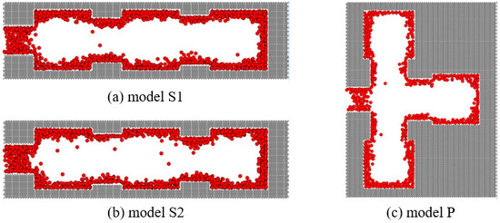 From the simulated isotherms, we can see that there is only one evaporation process in the simulated system with a main throat diameter of 3 nm, and the relative pressure of evaporation is around 0.5. We obtained snapshots of the molecules in the system under this relative pressure, as shown in Figure 10, indicating that cavitation occurs in all three pore cavities simultaneously.