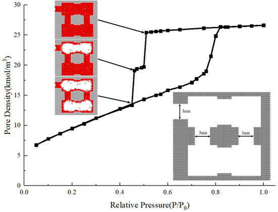 Secondly, we constructed another system in which a portion of the internal throats belong to the cavitation zone. The adsorption isotherm and molecular snapshots of the two-stage cavitation are shown in Figure 11.