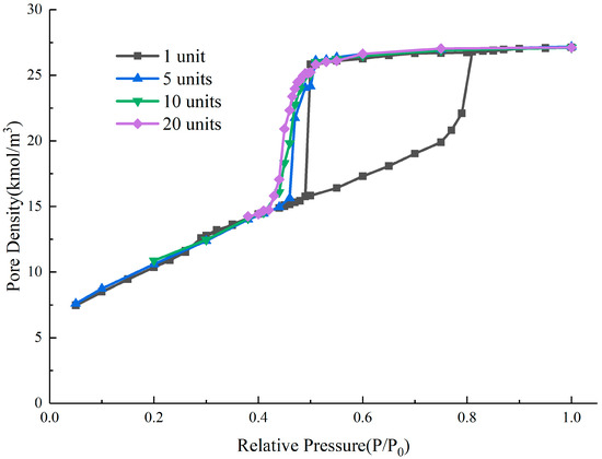 The hysteresis loop obtained from the simulation shows that there are two rapid declines in the desorption branch of the system, corresponding with the relative pressures of 0.5 and 0.45. The two-stage evaporation process of the desorption branch occurs both through cavitation, which is controlled by the outermost throat, and the vertical throats connected to the internal structure. The upper cavity evaporates through cavitation when the relative pressure is 0.5, while the lower cavity is controlled by multiple throats that belong to the cavitation zone, and cavitation occurs at the relative pressure of 0.45. In such a structure, a multi-stage cavitation process and the evaporation of some internal structures at a cavitation pressure below 0.5 are observed, which is different from the cavitation pressure in a single-throat ink-bottle pore, which is always 0.5. To further investigate the multi-stage cavitation process, multiple ink-bottle pore units with throat diameters and lengths of 3 nm and cavity diameters and lengths of 6 nm are connected head to tail, representing a multi-stage cavitation structure controlled by multiple narrow throats that can lead to cavitation. For these multilayer structures, we calculated the desorption branches of systems with different unit numbers and compared the results with the hysteresis loop of a single ink-bottle pore unit with a throat of 3 nm. The results are shown in Figure 12.