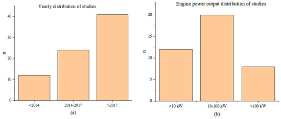 The studies’ taxonomy and engine categorisation. (a) Yearly distribution of studies, and (b) engine power output categorisation (studies with engines investigation).