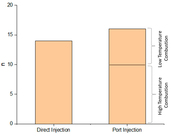 The engines investigated in the reviewed publications employed the following two methanol injection types (and the corresponding injection systems): port injection and in-cylinder direct injection. Port injection of liquid methanol takes place at the intake port when the intake valve is open (and with the exhaust valve closed), whereas in some rare cases, methanol is injected downstream of the turbocharger compressor. The methanol in-cylinder direct injection usually takes place close to the top dead centre. In both cases, the high-reactivity fuel (most frequently diesel) was directly injected in-cylinder. The methanol direct and port injection types are almost evenly studied, as shown in Figure 3. A total of 16 publications investigated premixed combustion, with 10 focusing on the high-temperature combustion method.