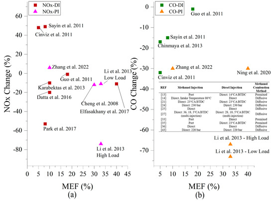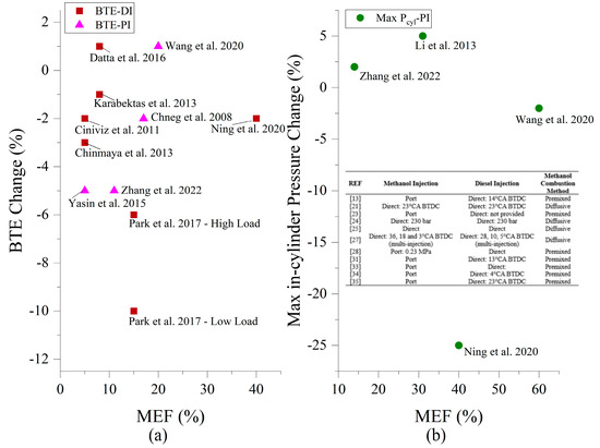 Ning et al. [41] quantified the combustion effects on the maximum in-cylinder pressure for up to 40% MEF in diesel engines. Compared to diesel mode, the use of alcohol fuels significantly reduced the peak in-cylinder pressure. Zhang et al. [45] reported that the 20% MEF in a diesel engine resulted in a 2% increase in the maximum in-cylinder pressure, which was attributed to the low methanol cetane number, faster evaporation, and more uniform atomisation. Figure 5b presents the influence of MEF on the in-cylinder maximum pressure for the premixed combustion engines studied in the preceding publications.