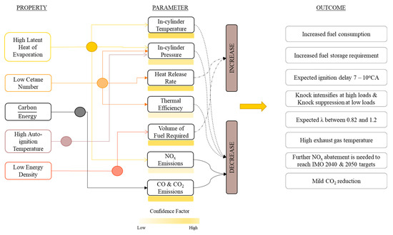 This section discusses methanol fuel characteristics compared to other fuels with established production technologies and use in dual-fuel engines, which were also considered in the reviewed studies. From the data presented in Table 2, methanol has a similar volumetric density to ethanol and diesel, while its lower heating value (LHV) is almost half compared to diesel fuel (and less than half compared to methane), implying challenges for the storage system. Methanol exhibits higher laminar burning velocity compared to diesel fuel (at the testing conditions: T = 340 K, P = 1 atm, Φ = 1) and, hence, is expected to undergo a slower combustion. Methanol’s latent heat of vaporisation is much higher compared to other fuels (ammonia or hydrogen) [11]. Diesel fuel substitution by methanol results in significant benefits pertinent to the engine’s environmental footprint, with lower CO2 emissions (due to its significantly lower carbon content) and almost zero sulphur emissions (due to the insignificant sulphur content), which renders methanol suitable for short- to medium-term compliance with pertinent regulations of the shipping sector.