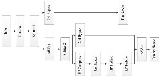 The configuration of the three-stream ACE studied in this article is shown in Figure 1 and Figure 2, consisting of a front fan, an aft fan, a high-pressure (HP) compressor, a combustor, a high-pressure turbine, a low-pressure (LP) turbine, a rear variable area bypass injector (RVABI), an afterburner, a primary nozzle, and a fan nozzle. After being compressed by the front fan, a portion of the airflow passing through the inlet enters the third bypass and is discharged by the fan nozzle, while a portion enters the aft fan. The airflow entering the aft fan is compressed and divided into two streams, with one stream entering the second bypass and the other stream entering the first duct (core airstream). After further compression by the compressor, the airflow in the first duct generates high-temperature and high-pressure gas through the combustor, which enters the HP turbine and LP turbine for expansion and work. Finally, it is mixed with the airflow in the second duct in the RVABI and discharged by the primary nozzle.
