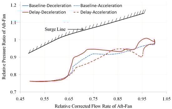 - The delay of the geometric adjustment mechanism affects the operating lines of the front fan and aft fan, therefore causing changes in their surge margin. Especially when A18 is delayed, the minimum surge margin of the front fan during deceleration decreases from 13% to 5%. When there is a delay α1 or α2, the minimum surge margin of the front fan during the acceleration process is reduced from 15% to 2%. The decrease in surge margin will limit the acceleration and deceleration time of ACE.