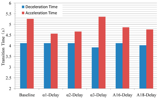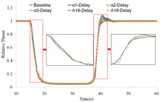Figure 9 and Figure 10, respectively, show the thrust-response curve and acceleration/deceleration-time statistics of the engine when the above-mentioned geometric adjustment mechanism is delayed. Among them, the values shown on the vertical axis of Figure 9 are the relative values of the actual thrust relative to the design point, and the acceleration and deceleration time shown in Figure 10 refers to the time it takes from the start of the throttle lever movement to the time when the thrust change reaches 95%. From Figure 9, it can be seen that when considering the delay of the geometric adjustment mechanism, except for the overshoot of the final acceleration stage when α1 and α2 are delayed, the acceleration and deceleration thrust-response curves basically coincide. From the local amplification of Figure 9 (as shown in the black squares in the figure), it can be seen that the thrust-response curve basically overlaps in the low-speed range, while in the high-speed range, the thrust-response curves vary with the delays of the geometric adjustment mechanisms, namely in the initial stage of deceleration and final stage of acceleration. These phenomena are related to the control laws of the geometric adjustment mechanisms, especially the constant guide vane angle of the compression component in the low-speed range. From Figure 10, it can be seen that α3 delay can shorten the deceleration time by about 0.2 s. In terms of acceleration time, except for the α3 delay that increases the acceleration time, other geometric mechanism delays shorten the acceleration time. The shortening effect is most obvious when α1 and α2 delay is about 0.6~0.7 s.