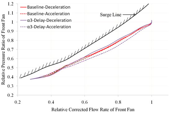 Comparison of Front-Fan Operating Line with α2 Delay and A16 Delay (own editing).