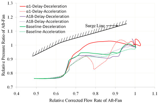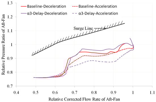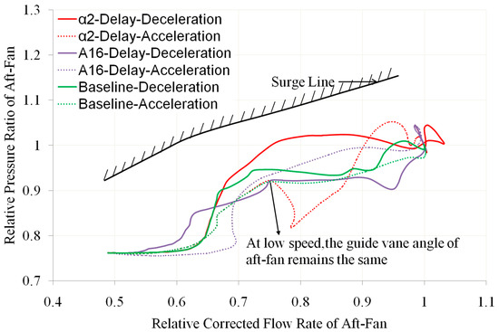 - The delay of the guide vanes α1, α2, and α3 of the three compression components affects the working characteristics of the aft-an. The main reason is that after the delay of the guide vanes, it will cause a large deviation in the flow into the throttle surface of the core flow channel, resulting in a change in the equivalent flow area of the throttle position and, ultimately the deviation of its working line. For example, if there is a delay in one of α1, α2, and α3 during the deceleration process, the flow entering the throttle position in the core flow channel increases, resulting in a decrease in the current flow area at the throttle position and an increase in the back pressure at the rear fan outlet, therefore causing the working line to move upwards. The analysis of the acceleration process is the opposite.