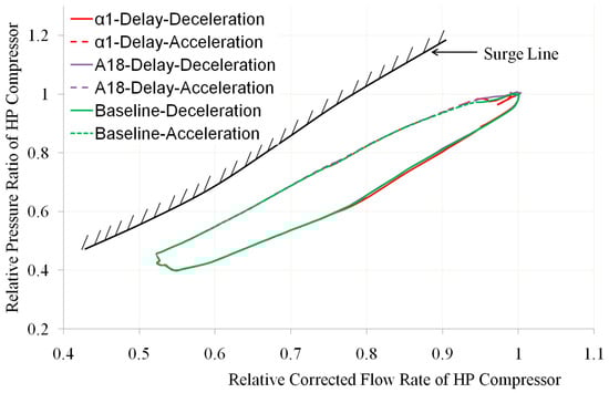 Comparison of HP Compressor Operating Line with α1 Delay and A18 Delay (own editing).