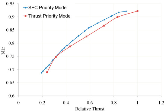- Based on the power level angle (PLA) at time , obtain the relative corrected speeds of the HP rotor in thrust priority mode and SFC priority mode, denoted as and , respectively.