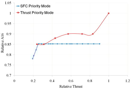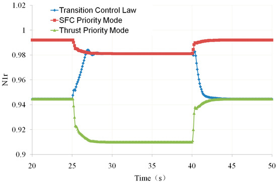 As mentioned earlier, an adaptive cycle engine has two operating modes: the thrust priority mode and the SFC priority mode. When the aircraft needs to fly at high speed, the engine is in the thrust priority mode, and when the aircraft needs to cruise, the engine is in the SFC priority mode. Therefore, for ACE studied in this paper, the transient characteristics also include the transition between these two modes. An important task in studying the characteristics of mode switching is to obtain control logic that enables the engine to transition smoothly and ensures that the thrust after conversion does not undergo significant changes compared to before conversion. However, based on the matching of the three-stream ACE in two operating modes, to ensure mode switching at the same thrust, N1r, N2r, α2, A16, and A18 all need to be changed. For example, when switching from SFC priority mode to thrust priority mode, it is necessary to reduce N1r and A18 (as shown in Figure 23 and Figure 24) and increase N2r and A16 (as shown in Figure 25 and Figure 26). The horizontal and vertical axes of these figures are dimensionless based on the design points.