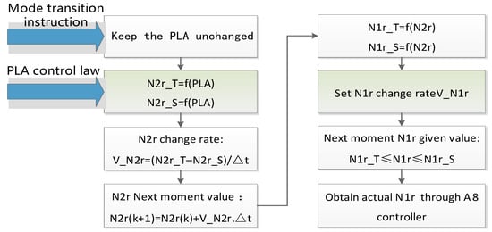 From these figures, it can be seen that the changes in the direction of the HP rotor speed and the LP rotor speed under the two working modes are opposite. If the N1r corresponding to the current time of N2r is used as the control target for A8, then during mode switching, the A8 regulation oscillation caused by the non-monotonic and rapid changes in the given N1r will cause significant fluctuations in important engine parameters, such as thrust. To solve this problem, a mode-switching control scheme was proposed, which gives two sets of throttle lever control laws, and when the engine receives a mode-switching command, the two sets of throttle lever control laws switch at a certain rate while giving the rate of change in N1r. The calculation process of this control logic is shown in Figure 27, and the corresponding description is as follows: