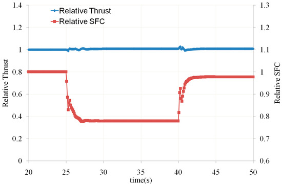 When calculating the transient performance, the fuel flow control law is a function of the total pressure at the outlet of the HP compressor and the relative corrected speed of the HP rotor [39], as shown in Equation (7):