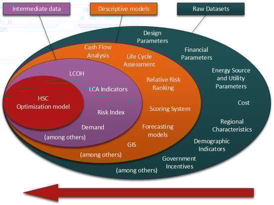 Figure 1 elucidates the structure of an SCDD (or HSCDD in our case) and its relationship with the optimization model. The raw data encompass collected information from a plethora of sources such as design parameters, costs, regional characteristics, and estimated or selected data like financial parameters. These raw data serve as the initial inputs for descriptive models. The outputs produced by these descriptive models, which we refer to as intermediate data, act as the essential inputs or optimization criteria for the creation of various optimization models. Additionally, raw data may also feed directly into these optimization models, acting as model parameters or decision variables, depending on the specific analysis needs.