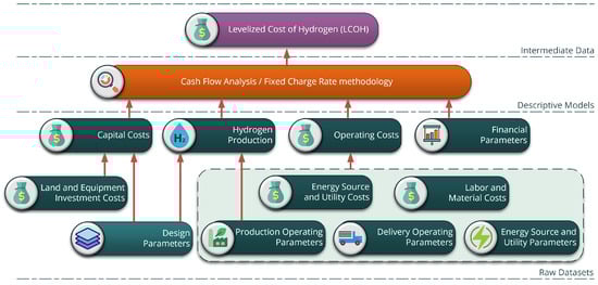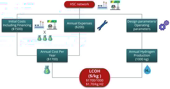 The concept of LCOH is derived from the levelized cost of electricity (LCOE), a measure commonly used in the economic assessment of energy projects [35]. The LCOE represents the net present value of the unit cost of electricity over the lifetime of a generating asset. Similarly, the LCOH reflects the average cost of producing one unit of hydrogen, factoring in all the costs over the life of the hydrogen production facility. This calculation process of LCOH is visualized in Figure 4.