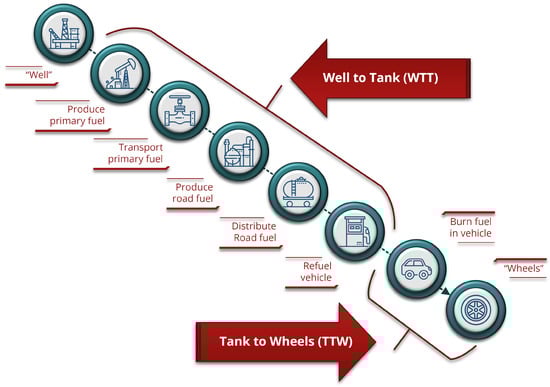 For a comprehensive and unbiased evaluation of the environmental impacts associated with a HSC network, a life cycle assessment (LCA) should be performed. This assessment must encompass all stages, including the recovery of the energy source, the production and delivery of hydrogen, and its ultimate consumption. A particular form of LCA used for transport fuels and vehicles is the “Well-to-Wheels” (WtW) analysis. As shown in Figure 6, this analysis is often divided into two primary stages: “Well-to-Tank” and “Tank-to-Wheels”.