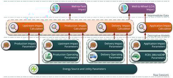 Hence, a broader array of environmental indicators should be considered when employing LCA or WtW approaches. This methodology can evaluate the environmental impact from various perspectives, offering a more comprehensive understanding of the ecological footprint of the HSC network. As depicted in Figure 7, we break down the “Well-to-Tank” stage into “Upstream Impact Calculation”, encompassing the recovery and transportation of the energy source, “Production Impact Calculation”, and “Delivery Impact Calculation”, which correspond to hydrogen production and delivery, respectively. We extend the “Application Impact Calculation” to take into account not only FCEVs but also the CHP and Micro-CHP systems. This diversified approach can offer a more accurate and inclusive picture of the environmental effects of hydrogen production, distribution, and use across multiple applications.