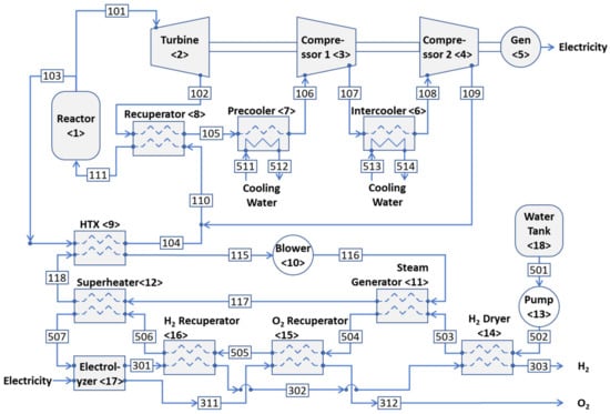 The accelerated use of fossil fuels for economic development not only leads to their depletion but also severely affects the environment. The use of nuclear energy [1,2,3] is inevitable to reduce the dependence on fossil fuels in the energy sector. Jaszczur et al. [1] examined sulfur–iodine (S-I) and copper–chlorine (Cu-Cl) cycles using high-temperature Onuclear reactors. A four-step Cu-Cl cycle was used to produce hydrogen using a supercritical water-cooled reactor [2]. Milewski et al. [3] investigate two types of high temperature electrolyzers for hydrogen production using nuclear power plants. The high-temperature gas-cooled reactor (HTGR), which is the basis of small modular reactors (SMR) that requires a special design for the reaction core [4], is evaluated as a suitable system for the purpose of reducing the use of fossil fuel [5,6]. The reactor’s inert gas cooling and heat-resistant structure enable it to reach core exit temperatures of up to 950 °C [5] compared to other predictable reactors.