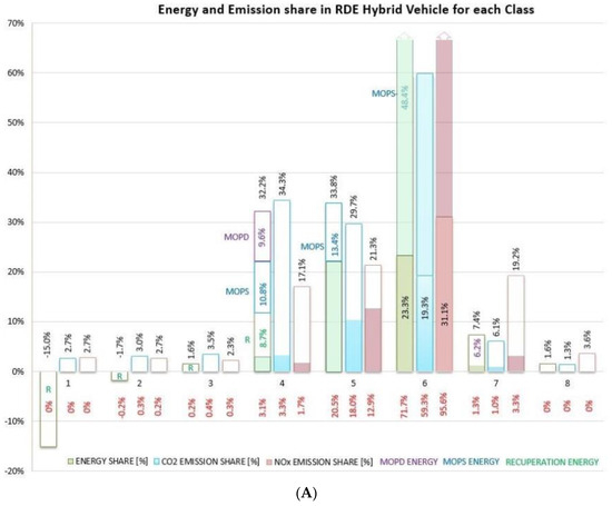 (A) Energy distribution and emissions of the VSP hybrid model in the RDE cycle. (B) Time shares of power classes. (C) Mean power for each class hybrid vehicle.