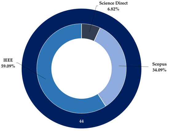The figures below describe the overview of the number of articles conducted in the SLR. Figure 1 presents the percentage according to each database from which the articles were initially selected. Out of the 5828 initially selected articles, the percentages related to each database are shown. This pattern repeats for the first and second refinements, represented by 157 and 44 articles selected, respectively. Among these selected articles, the percentages related to each database are presented (Figure 2 and Figure 3).