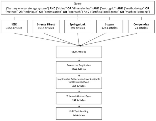 - Keywords: (“battery energy storage system”) AND (“sizing” OR “dimensioning”) AND (“microgrid”) AND (“methodology” OR “method” OR “technique” OR “optimization” OR “approach”) AND (“artificial intelligence” OR “machine learning”);