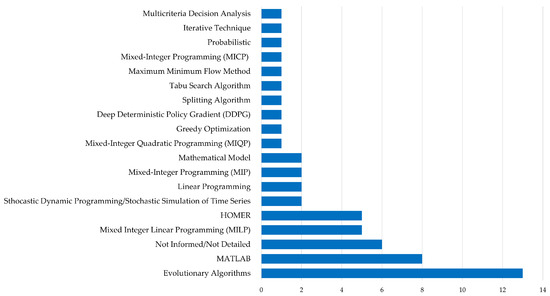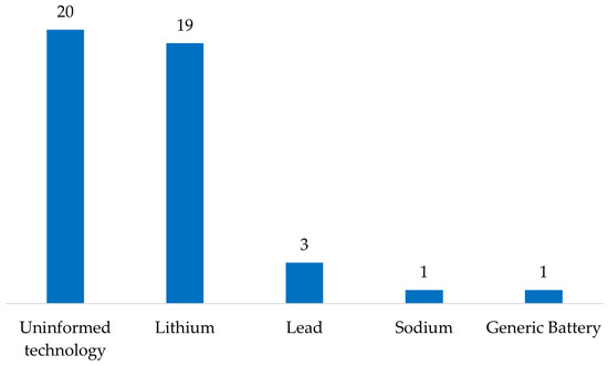 This research question addresses the pivotal point of the SLR, which is the sizing of BESSs for hybrid energy systems. The impacts of battery technologies can vary depending on the application, energy sector, system space allocation, cost, and lifespan, among other factors. To answer this question, data from each article in this SLR related to the technologies used were collected and illustrate the results in the graph shown in Figure 14.
