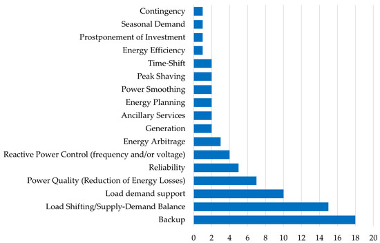 The Backup application is predominantly used because it supports the load, MG, or hybrid plant. This application provides energy availability during emergencies or failures in the primary energy source, either the grid or renewable generation.