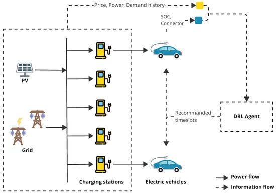 A model-free reinforcement learning algorithm called Q-learning was proposed in [] to optimize the charging cost for Vehicle-to-Grid (V2G) and Grid-to-Vehicle (G2V) charging behavior. Another use of Q-learning is the routing plan, presenting an energy-efficient solution for the EVs online. This approach assumed the model limitations in terms of handling a high-dimensional Q-table, which is addressed by employing Deep Q-Learning (DQL) methods. The authors in [] propose a smart scheduling solution to coordinate the EV charging control of the voltage in the grid regarding the uncertainties of the charging process and load demand. Another model-free reinforcement learning is the Deep Deterministic Policy Gradient (DDPG), which has proven its prominence in solving the charging scheduling task specifically in continuous action–space environments. A real-time scheduling strategy was proposed based on the price signals to tackle the problem of a substantial number of EVs powered by the distribution network. In [], the authors use Multi-Modal Approximate Dynamic Programming to optimize the scheduling of charging and discharging EVs while considering a single objective, which is the pricing schema []. The literature review indicated a remarkable focus on DRL techniques to address the charging scheduling problem. The authors in [] proposed a DRL approach based on the Deep Q-Network (DQN) model that recommends the optimal charging station at the beginning of the trip based on the following features: State of Charge (SOC), trip distance, average speed, charging prices, and energy demand. However, this model presents some limitations, which are the long training time and the used dataset, which was not collected for real-world use cases. The challenge of the determination of the optimal charging scheduling-based model-free DRL model is tackled in previous research while considering the randomness of pricing and user preferences [].