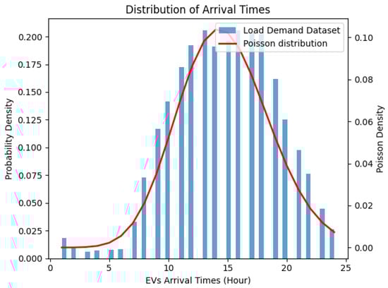 - M: Markovian Arrival Process: In the EV scheduling context, M signifies that the arrival time of the EVs at the CS follows a Poisson process defined by:where is the average arrival rate per hour and n is the occurrence of the charging event. Figure 6 depicts an example of the arrival time per hour. Based on this graph, we can conclude that the EV arrival times at the CS are independent.