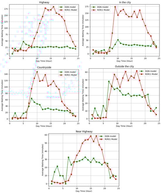 We conducted the described method on 10,000 scenarios to effectively evaluate the agent performance. The graphs in Figure 8 outline the agent’s recommended time slots demonstrating lower waiting time compared to the baseline model for the majority of the locations and during different times of the day. In the highway, city and countryside locations, a significant optimization in the waiting time is observed, especially at high demand hours between 10 a.m. and 8 p.m., compared to the baseline model M/M/1 queuing model. This disparity highlights the effectiveness of our proposed approach in bringing significant benefits to both rural and urban citizens as well as commuters. Further detailed analyses are summarized in Table 2.