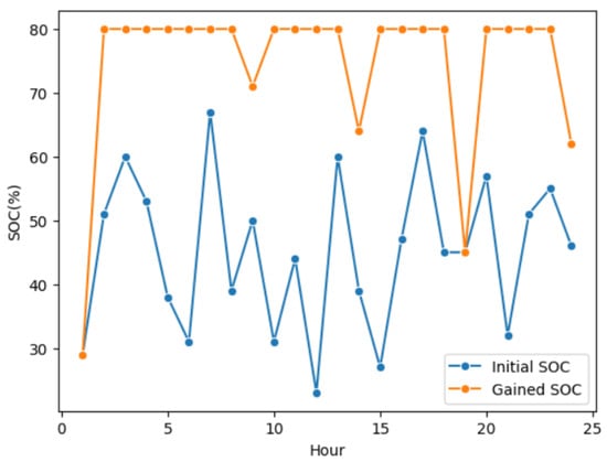 One of the primary targets of the scheduling problem is to provide the EV with a full charging experience. We set random initial values of the SOC and observed the agent’s behavior. We evaluate its performance to select the optimal time slot that guarantees full charging for the EV, as described in Figure 9.