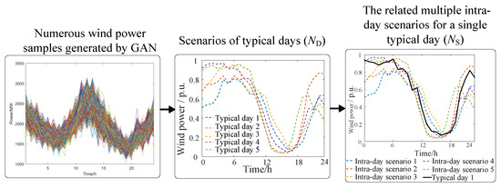 Due to the fluctuation over a long-time scale (such as one year) and uncertainty over a short time scale (such as one day), the capacity configuration optimization needs to be adapted to the wind power output of all scenarios. In this paper, the seasonal fluctuation of wind power generation in one year and the uncertainty in one day are both simulated using multiple scenarios. Specifically, the power outputs of wind power in one year are represented using the scenarios of typical days. Then, considering the scenarios of typical days, related multiple intra-day scenarios are generated to simulate the uncertainty of wind power, as shown in Figure 2.