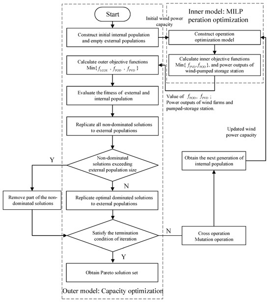 Subsequently, the values of objective functions 2 and 3 and the optimal schedule for the WPHSH systems is converted to the outer optimization problem. The outer optimization model utilizes strength Pareto evolutionary algorithm II [35,36] to calculate fitness functions and generate the decision variable particles, which reflect the wind capacity. The updated wind power capacity is converted to inner optimization. With the iteration process, the Pareto optimal solution set can finally be obtained.