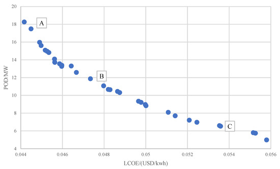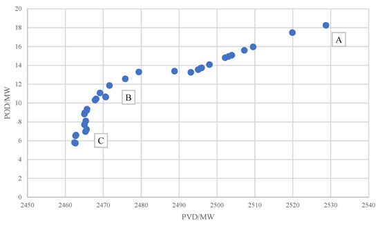 Table 3 shows that from point A to point C, the total installed capacity of wind power decreases from 1429 MW to 532 MW, the LCOE increases from 0.044 USD/kWh to 0.047 USD/kWh, and the PVD decreases from 2528 MW to 2462 MW. Combined with Figure 6, it can be determined that as the installed capacity of wind power decreases, the output generation power of the hybrid system decreases, and the LCOE increases. At the same time, when the wind power installation capacity increases, the peak–valley difference of the net load of the regional power grid also increases due to the limitations of pumped storage regulation capabilities and reservoir capacity. Similarly, as seen in Figure 7, with a decrease in the installed capacity of wind power, the LCOE increases. Also, the wind power uncertainty caused by wind power was found to decrease, and the power outputs of WPHSH systems can be better stabilized, thus decreasing the POD of WPHSH systems. Figure 8 shows that increasing the installed capacity of wind power leads to a larger POD and PVD in WPHSH systems due to the anti-peak shaving characteristics and uncertainty of wind power.