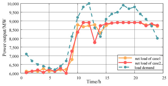 Figure 9 shows a comparison of the net load curve of Case 1 and Case 2 on a typical day 1. The water storage of the lower reservoir in the two cases is shown in Figure 10. As shown in Figure 9 and Figure 10, from time intervals 3 to 8, the power loads are relatively low while wind power outputs are high, and the pumped storage units are operated under pumping conditions. In comparison, as fixed-speed pumped storage cannot adjust the power under pumping conditions, the pumped storage power station in Case 2 is continuously pumped with a fixed pumping power, resulting in the water storage of the lower reservoir approaching the minimum allowable storage limitation at time interval 7. Then, the pumped storage unit cannot maintain the pumping condition at time interval 8 to achieve load filling. Therefore, in Case 2, the valley of net loads appears at time interval 8. In contrast, in Case 1, the pumping power of the variable-speed pumped storage unit can be adjusted, and the pumping water flow can be changed accordingly. Therefore, the pumping condition can be maintained at time interval 8 so as to regulate the peak–valley of net loads better with the reservoir’s operational constraints met.