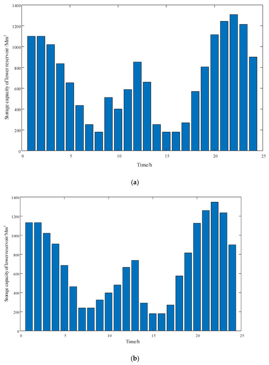 The real-time storage capacity of the lower reservoir on typical day 1. (a) The storage capacity of lower reservoir on typical day 1 of Case 1. (b) The storage capacity of the lower reservoir on typical day 1 of Case 2.